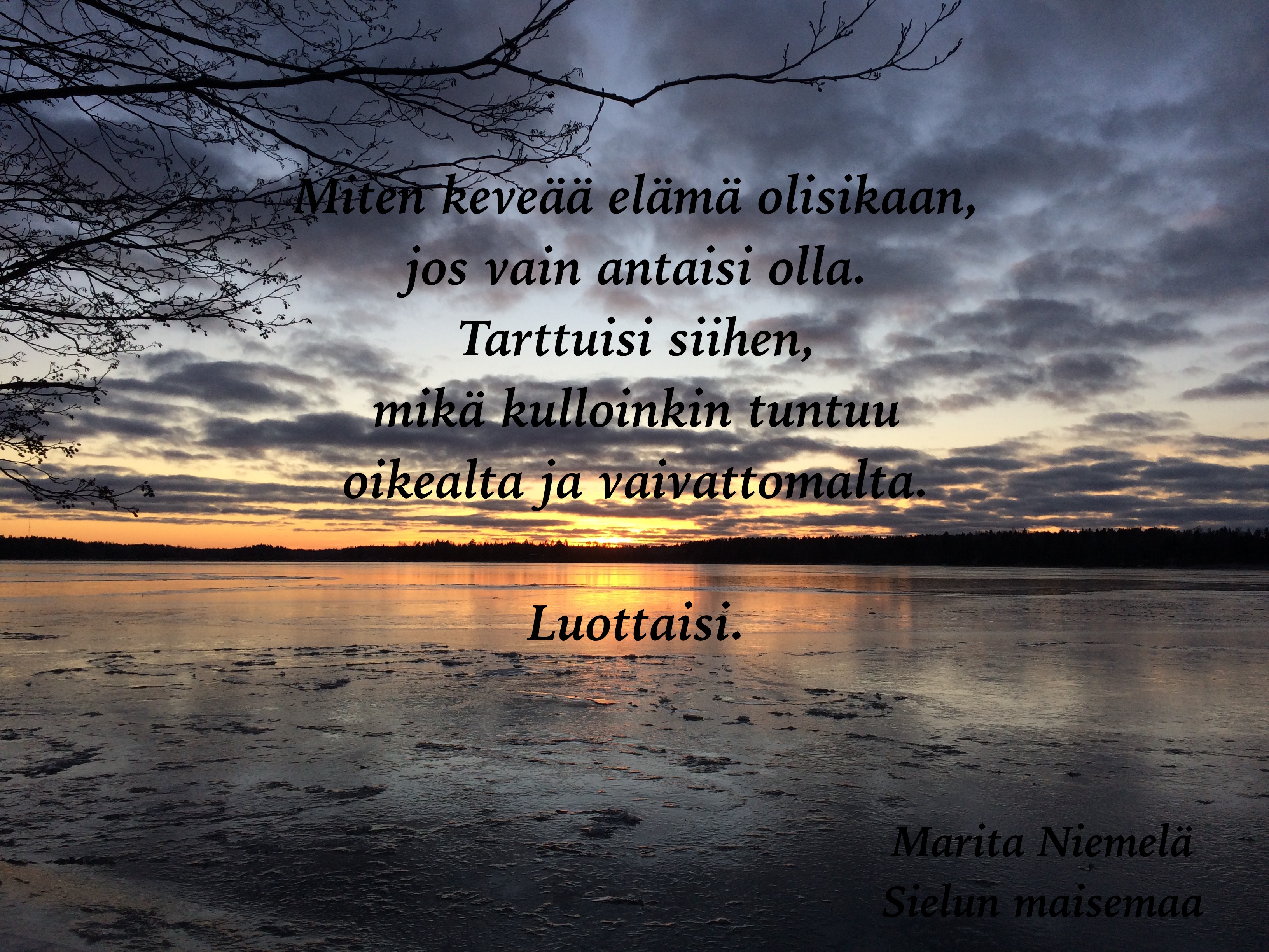 Valoa ja voimaa On 5 helmikuun, 2016 Tekijä Marita Niemelä Jaa tämä: Jaa X:ssä(Avautuu uudessa ikkunassa) X Jaa Facebookissa(Avautuu uudessa ikkunassa) Facebook Tykkää Lataa... Aiheeseen liittyy